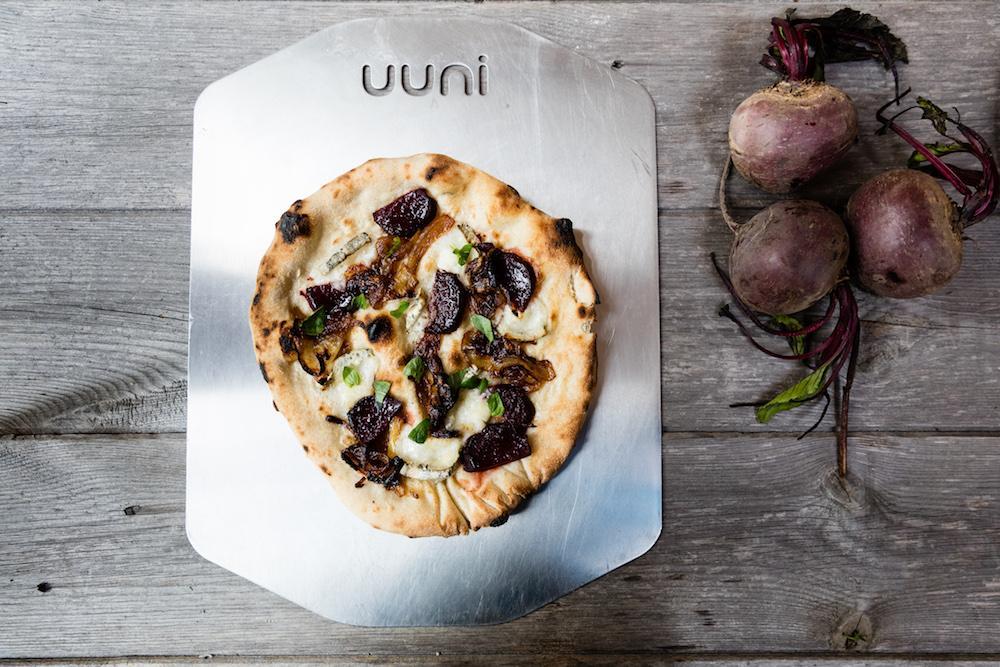 Using a small amount of flour, dust your Ooni pizza peel. Stretch the pizza dough ball out to 12"/16” and lay it out on your pizza peel. Top with the caramelised onion, goat’s cheese and beet.