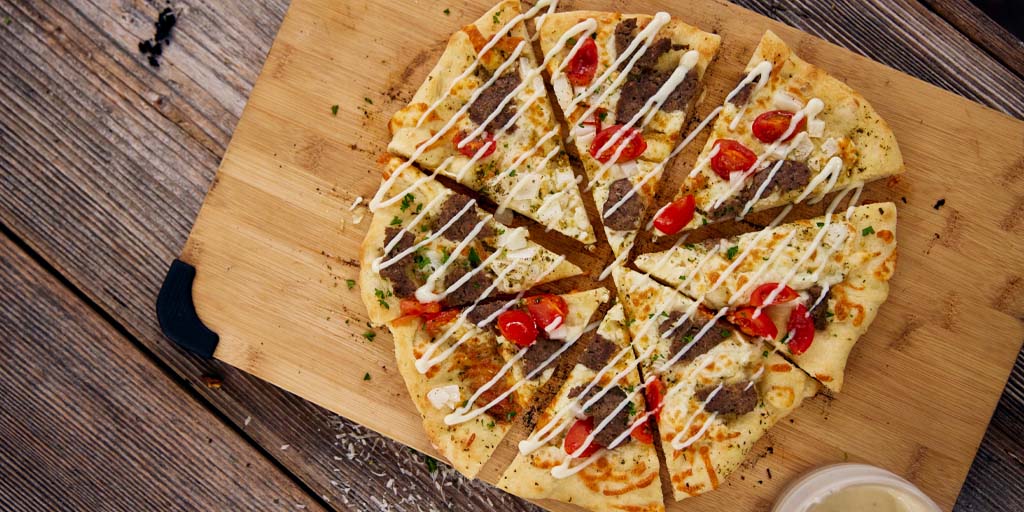 Here, journalist, former line cook and one-time pizzaiola Ivy Knight (@ivyporkchopknight) marries the best of Canadian legends King of Donair and Nimrod’s versions to create this quintessential pie. A classic pizza dough base is topped with mozzarella, tomatoes, onions and thinly sliced donair meat (a mix of ground beef and lamb). For a savoury twist, the crust is dusted with za’atar—a Middle Eastern spice mixture that includes thyme, marjoram, sumac and toasted sesame seeds—and the pie is drizzled with sweet donair sauce. Odd? Maybe a little. Delicious? Absolutely.