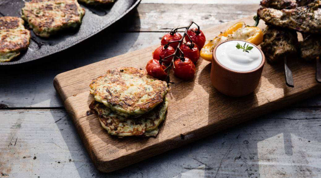 Once all of your fritters are cooked, serve with your toppings of choice and lashings of greek yogurt. We like to use vine tomatoes, mozzarella, and baby peppers!