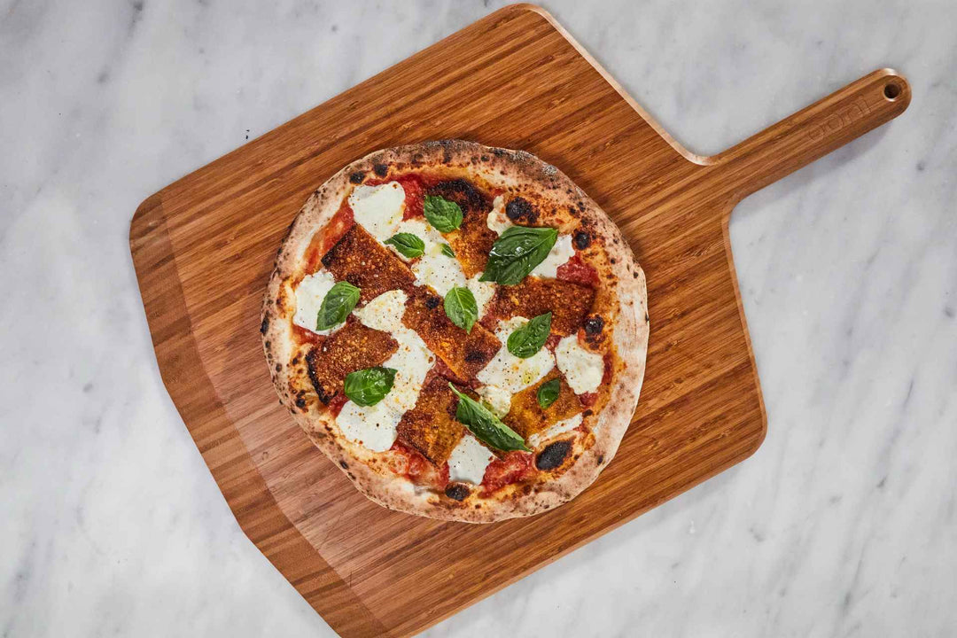 Thinly sliced and golden fried pieces of eggplant, crushed tomatoes, ricotta and fresh mozzarella top a Neapolitan pizza base for a deconstructed riff on an Italian dish that’s been around in some form since the 1700s. While eggplant parmesan is usually baked in the oven and served alongside pasta, our recipe takes all the elements of the dish and throws them on top of a pie in homage to slices we’ve seen at pizza shops around the United States.