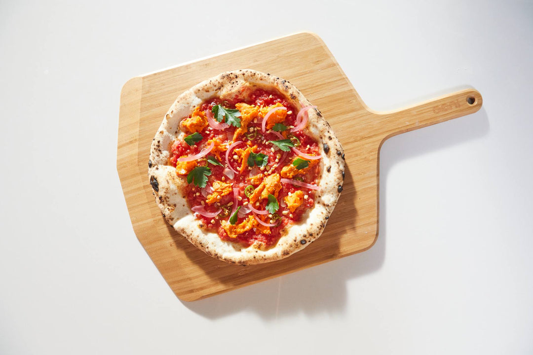 Here, harissa powder, a North African smoked pepper spice blend, is mixed into our tomato base and forms the base of this pizza’s flavour profile. When making your spiced sauce, feel free to up the amount of harissa, depending on your personal spice tolerance. (The same goes for the hot peppers.) We like serranos for their color and flavour, but you can calm things down with jalapeños or turn up the volume on the spice by substituting habaneros.