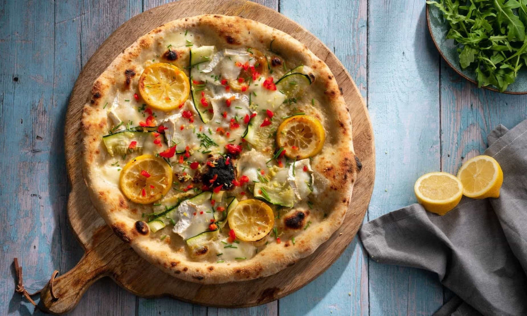 Squeeze the day with this zesty pie! We know it’s a rogue choice but trust us - deliciously sweet and sour lemon complemented by zucchini, creamy goat cheese, red-hot chillies and summer-fresh chives is the go-to pizza for summer!