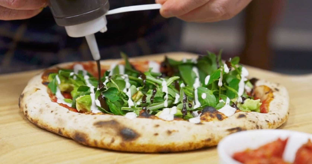 Once cooked, remove the pizza from the oven and top with the mozzarella, tomatoes, salad leaves, Parmesan and a drizzle of both the lemon & garlic mayo and the black garlic & miso balsamic glaze. Serve while hot!