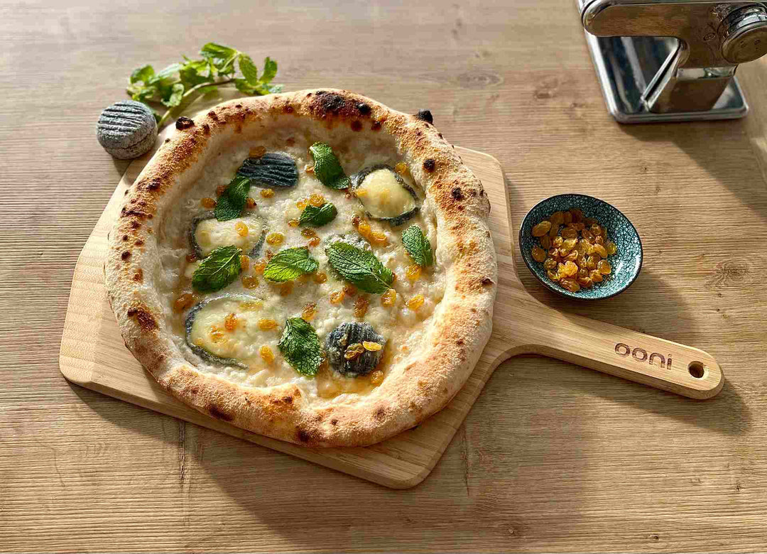 As far as goat cheese is concerned, ashy goat cheese, with its strong taste and flavor post-bake, is quite popular in France, but really, any soft variety here will work great. When slicing the cheese, make sure to be generous with the thickness, for a hearty, textured bite. The combination of goat cheese with spiced honey adds a touch of sweet and heat to your pizza. For the finishing touches, we added raisins and fresh mint leaves for a modern approach. Simple, elegant and most importantly, delicious.