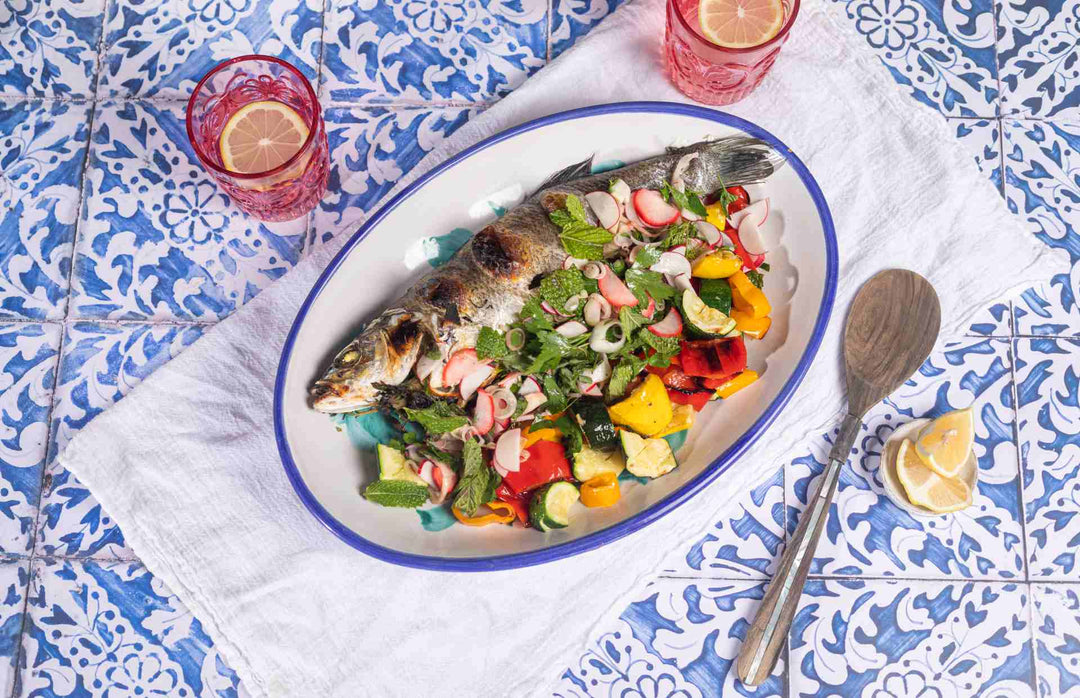 While it’s tempting to stick to filets when you’re craving fish, don’t sleep on cooking it whole. The bones can help to avoid a dry, unappetizing final result by adding moisture, flavour and additional protection from the heat. That’s why we’ve chosen to pan-roast a whole branzino (the Italian name for sea bass), topped with a fresh salad. Found off the coast of western and southern Europe, branzino is sweet and mild and crisps up nicely in the oven in under 20 minutes – perfect for when you’re short on time but don’t want to skimp on flavour.