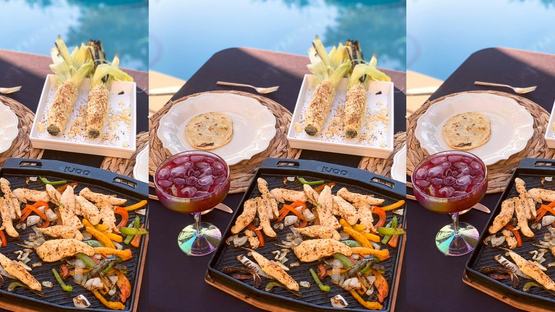 Kick back with this delicious wood-fired menu from none other than Ooni ambassador Mike Holman (@pizzainthesac). From sizzling chicken fajitas cooked with sweet peppers, to homemade tortilla and creamy elotes, washed down with zingy blackberry and jalapeno margaritas.
