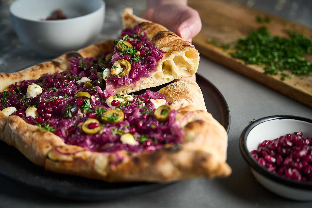 Pour la pizza salée, je la souhaitais particulièrement festive, pleine de saveurs audacieuses et de couleurs vives. J'adore la combinaison méditerranéenne d'oignons sucrés et caramélisés et d'olives noires saumâtres, dont la meilleure comparaison est peut-être la tarte provençale classique appelée pissaladiére. Ce plat fait appel aux anchois (qui seraient également parfaits sur cette pizza), mais j'ai préféré me tourner vers la région du sud-est, notamment la Perse. La base oignon-olive est parsemée de graines de grenade (originaires de Perse, elles symbolisent la richesse, la fertilité, la vie et la mort dans de nombreuses religions, dont le judaïsme), de feta et d'une poignée de persil et de menthe hachés.