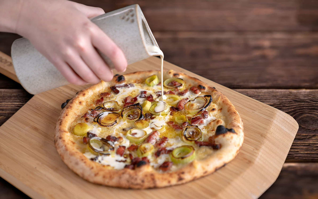 Arrosez votre base de pizza de crème fraîche avant et après la cuisson pour obtenir une sauce béchamel simplifiée. Recette de pizza blanche emblématique de Peggy Paul Casella, testeuse de goût de pizza, cette pizza au bacon, aux poireaux et à la crème met votre fonte à profit pour cuire une pizza regorgeant de morceaux de bacon croquants et de poireaux sautés sucrés.