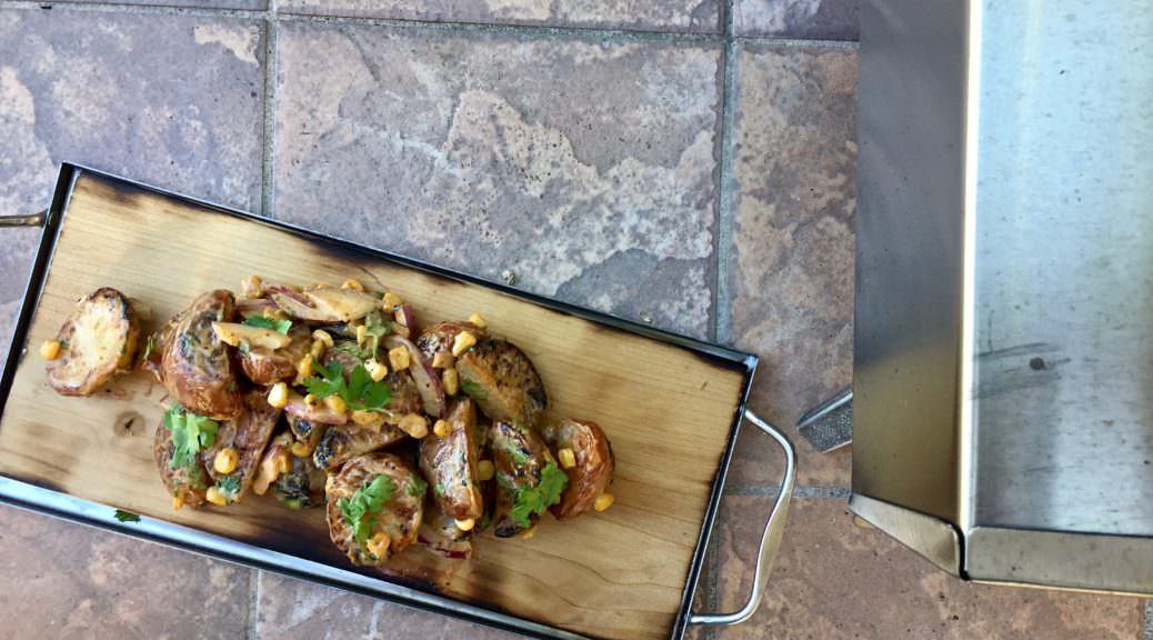 Des pommes de terre tendres et rôties au barbecue sur du maïs grillé, du citron vert acidulé, une sauce barbecue fumée, de la coriandre et de la mayonnaise.