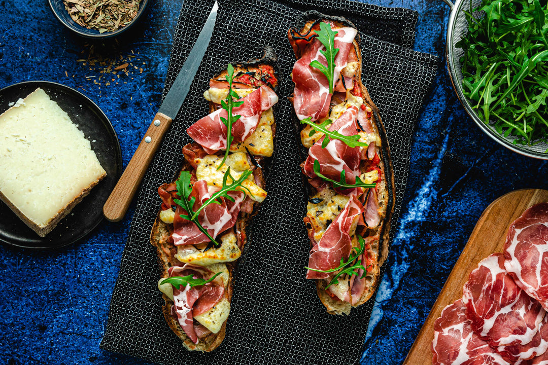 La Corse est une île française située dans la Méditerranée reconnue, entre autres, pour la beauté de ses paysages, sa culture et sa cuisine unique. La charcuterie corse est particulièrement réputée pour ses produits frais et artisanaux fabriqués à partir de viande de porc de haute qualité et de recettes traditionnelles. C'est de là que Guillaume Marinette (@guillaume.marinette), écrivain et photographe résidant en France, s'est inspiré pour créer cette pizza baguette corse.
