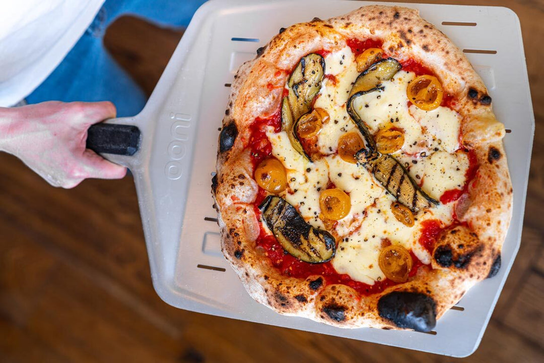 À l'aide d'une petite quantité de farine, saupoudrez votre pelle à pizza Ooni. Étirez la boule de pâte à pizza et posez-la sur votre pelle à pizza. Avec une grande cuillère ou une louche, étalez une couche uniforme de votre sauce sur la base de la pizza. Recouvrez de bandes de mozzarella fior di latte, puis posez la courgette cuite à la flamme sur le dessus. Terminez avec une poignée de tomates cerises.