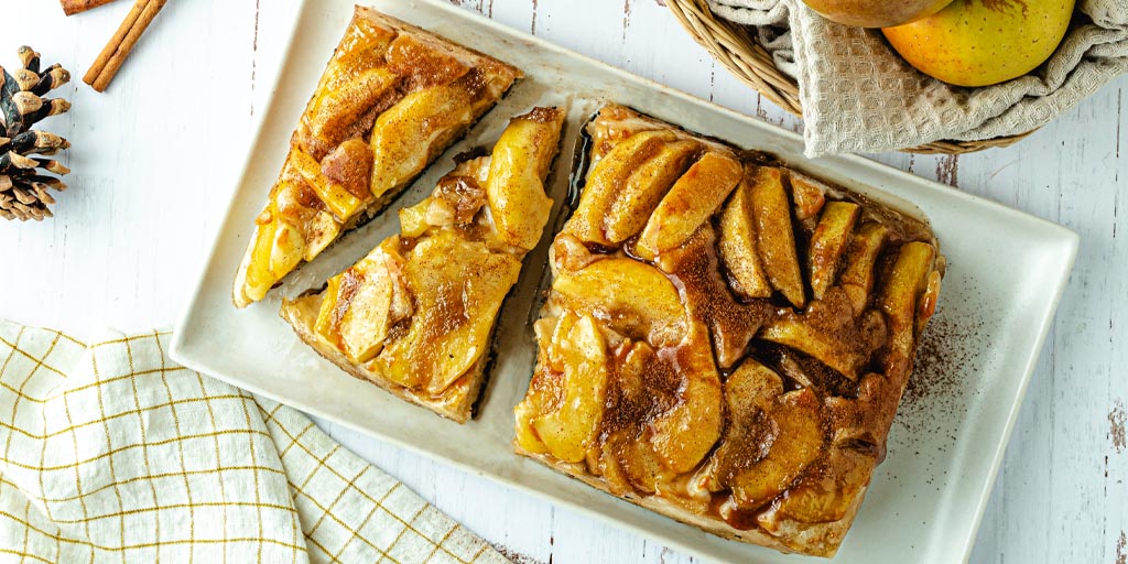 Pour Guillaume Marinette (@guillaume.marinette), auteur culinaire, animateur YouTube et photographe vivant en France, la tarte Tatin - une tarte aux fruits renversée composée de pommes moelleuses et caramélisées sur une base de pâte feuilletée - est plus que délicieuse : elle est nostalgique. Il l'a préparée pour la première fois à la maison lorsqu'il était enfant et en a créé une version résolument plus adulte qui s'inspire d'une source improbable : la pizza de Détroit. Pensez à la pâte, mais avec une croûte plus épaisse et plus moelleuse et des tranches de pommes tendres enrobées d'un caramel soyeux et fondant à la place de la sauce tomate et du fromage.