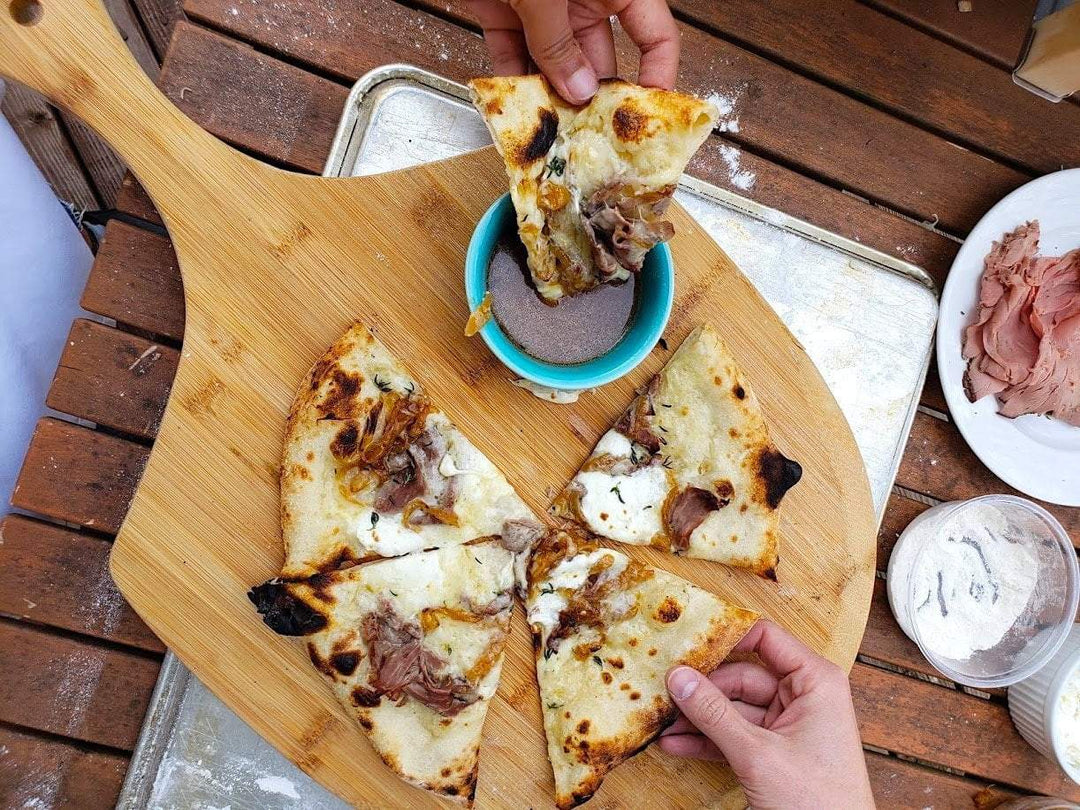 Prenez une baguette, remplissez-la de rôti de bœuf finement en tranches, de fromage suisse et d'oignons, et trempez-le dans un bol de jus de boeuf - c'est un classique américain, le sandwich à la trempette française. Maintenant, transformez ce classique en pizza! Cue la pizza en sandwich à la trempette française, une recette de Pizza Taste Tester Allison Torsani.