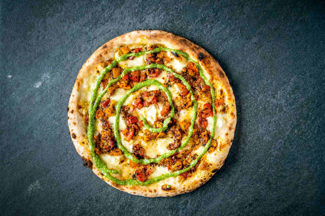 Lorsque vous avez envie d'un plat qui met en valeur une abondance d'ingrédients frais, nous aimons penser que cette délicieuse pizza au pesto et aux tomates est idéale. Cette combinaison colorée marie le goût classique du pesto italien et des tomates anciennes mûres sur une pizza qui convient particulièrement bien au printemps et à l'été