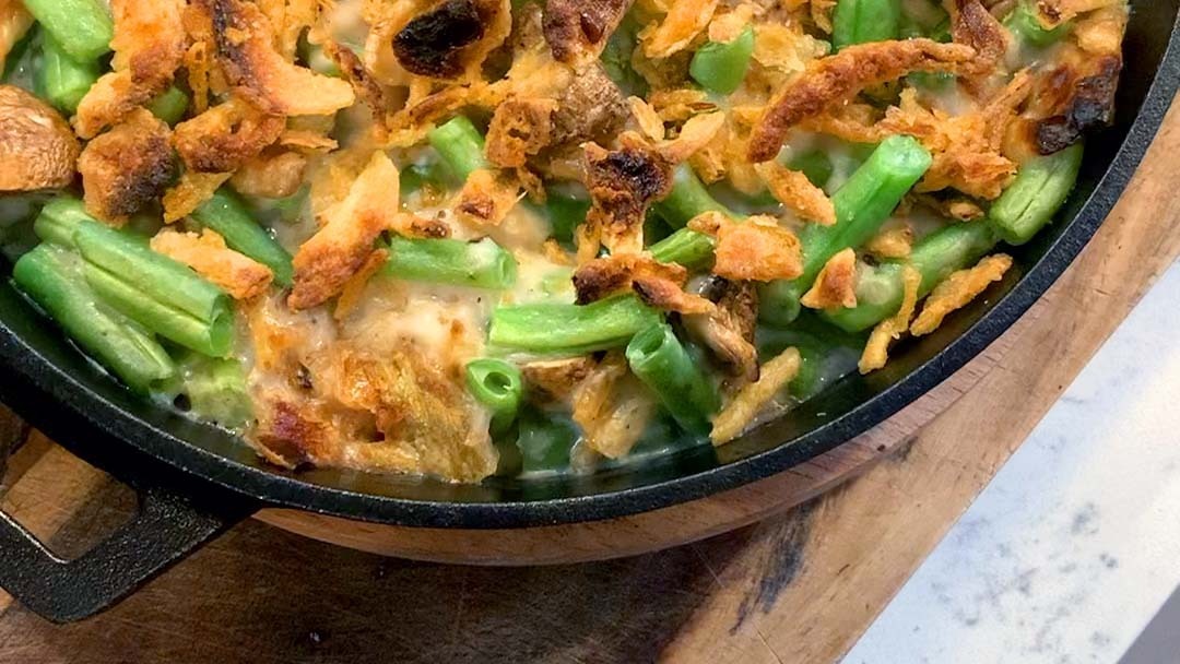 Ce ragoût classique de haricots verts de l'ambassadeur Ooni Mike (@pizzainthesac) est parfait à préparer la journée précédant votre grand festin. Gardez-le simplement au réfrigérateur pendant la nuit et chauffez-le dans votre four à pizza Ooni le lendemain. Les champignons ajoutés et les oignons frits croustillants donnent à ce plat une délicieuse texture carnée.