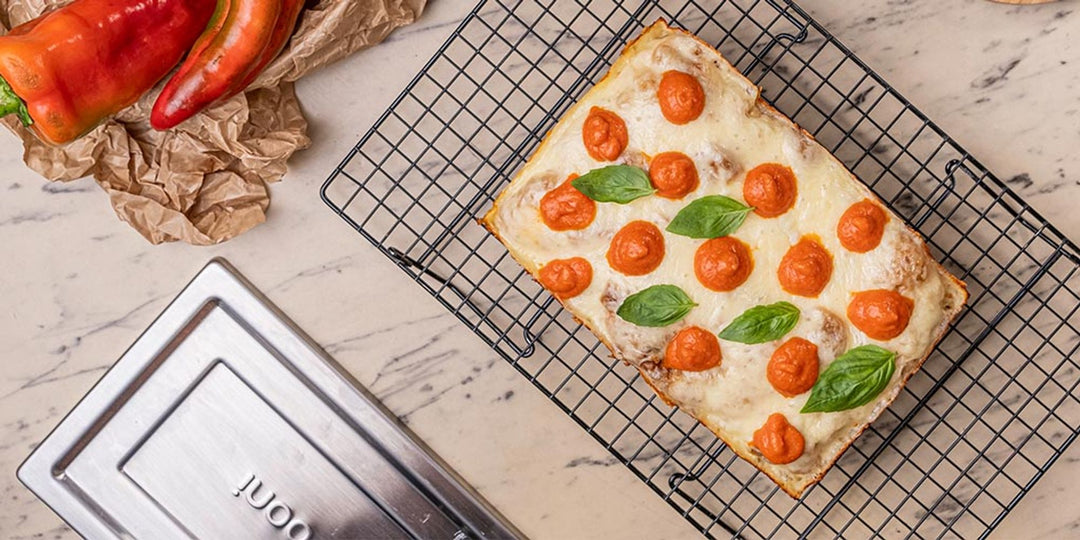 La pizza façon Détroit (PFD) est présente sur le marché depuis sa création dans les années 1940, avec sa forme distinctive, sa base épaisse et moelleuse et sa croûte croustillante et dorée au fromage "frico" (pour en savoir plus sur ce style et d'autres pizzas au moule, lisez ici). Chez Ooni, nous sommes tellement amateurs que nous avons créé notre propre moule à pizza façon Détroit, alliant le design traditionnel à la technologie moderne pour préparer ces pizzas authentiques et délicieuses à la maison. Nous avons également fait appel à des chefs, des auteurs et des pizzaiolos du monde entier pour qu'ils donnent leur propre touche à ce classique. À quoi ressemblerait une PFD si elle avait vu le jour en Scandinavie, en France, en Italie, au Royaume-Uni ou ailleurs ? C'est ce que nous avons cherché à découvrir. Chaque offre est une interprétation créative et savoureuse de cette grande pizza américaine.