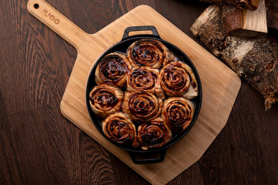 Placez la poêle dans votre Ooni. Placez-la aussi près que possible de l'ouverture et faites cuire pendant environ 20 minutes, ou jusqu'à ce que les rouleaux soient gonflés et dorés. Éteignez la flamme de votre Ooni et laissez les rouleaux continuer à cuire lentement dans la chaleur résiduelle du four. Une fois cuits, retirez la poêle du four et laissez refroidir pendant 5 minutes. Faites attention lors de la manipulation car le sirop au fond des rouleaux sera extrêmement chaud.
