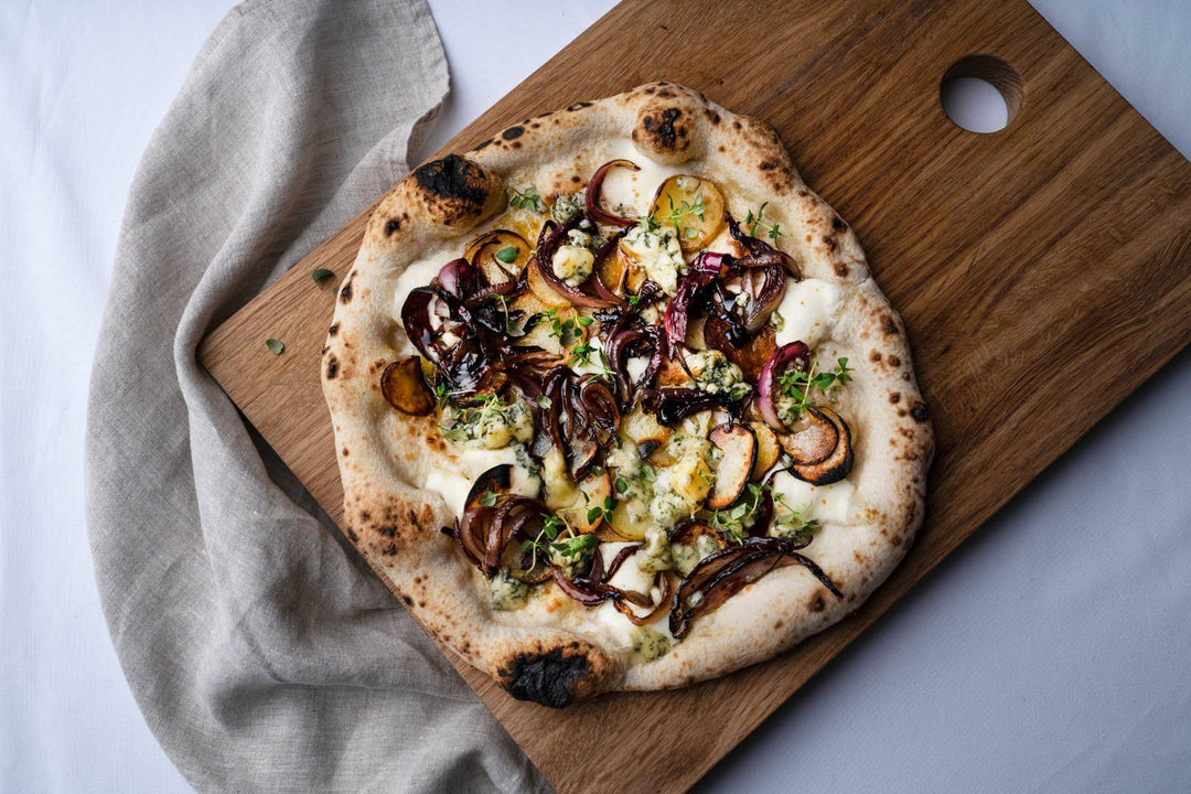 Pizza aux pommes de terre, au fromage bleu et aux oignons rouges balsamiques