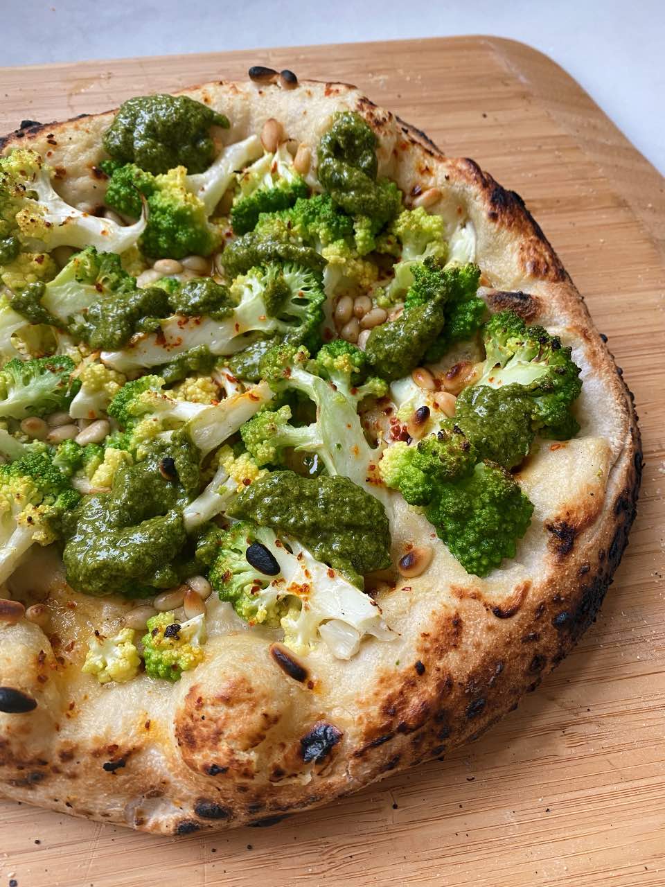 Cette recette d'Elly Curshen, grande cheffe britannique, chroniqueuse de Waitrose Weekend et autrice réputée du Sunday Times vous étonnera avec cette recette fraîche et innovante. Elle y associe une sauce verte méditerranéenne aux herbes et un chou romanesco rôti, avec une crème de cajou maison. Pour une pizza unique à la valeur nutritionnelle exceptionnelle… qui est aussi vegan !