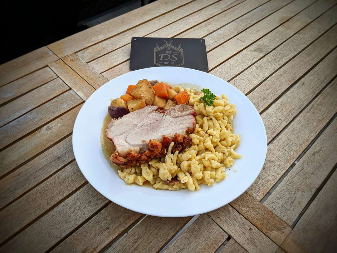 Cooking Schweinekrustenbraten in an Ooni oven is simple, thanks to Bavarian grill enthusiast Dominic Stettner (@dominic.stettner), who brought this delicious Ooni recipe to life. All you need is a deep stainless steel baking dish (that can sustain temperatures of 200°C / 392°F), tin foil, and a wired meat thermometer to ensure the meat is cooked thoroughly. After a sear on both sides, the cut is slow-cooked atop a bed of seasonal root vegetables, which infuse with the juices, stock, and dark beer as they cook. Later, the vegetables and juices are blended to make a beautifully rich sauce. The crispy pork rind is cooked last, and requires a strong lick of flames which caramelise the fat. Carve with your sharpest knife and serve with sauce and vegetables—washed down with a tankard of Bavarian beer! This dish should be enjoyed all year round, but it's especially apt to warm the cockles in the colder fall and winter months, and makes a great alternative to traditional beef or chicken roasts.