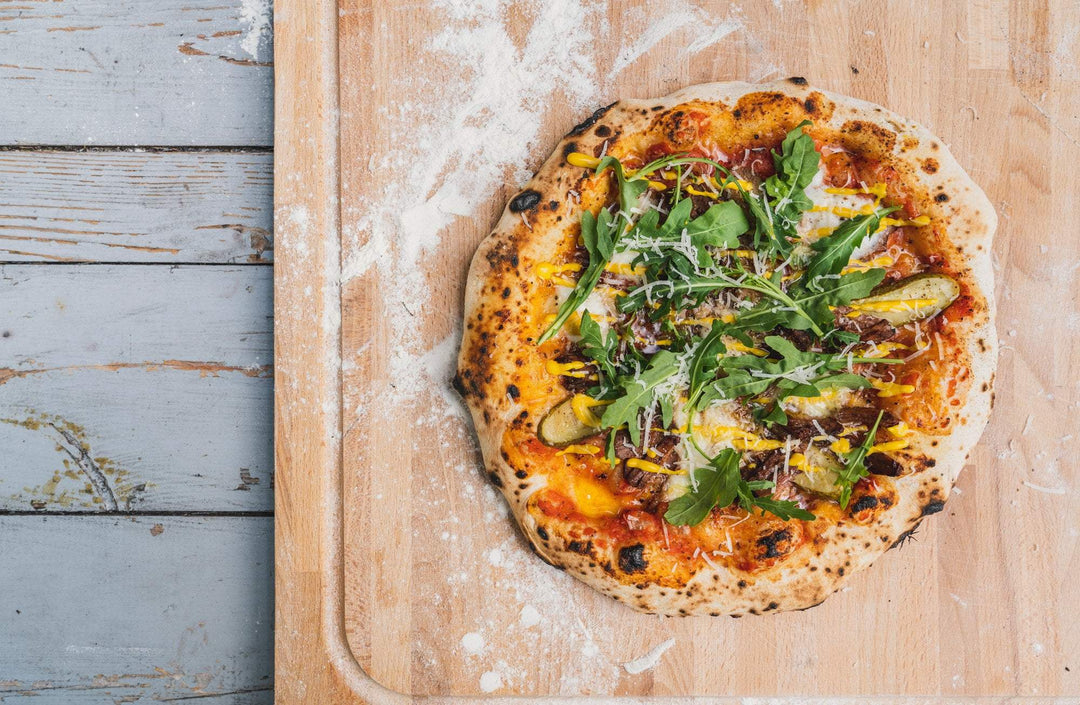 En utilisant notre recette de poitrine de bœuf lentement braisée, garnissez une pizza de bœuf tendre onctueux ainsi que de cornichons à l'aneth croquants et acidulés, d'une pointe de moutarde jaune et de roquette fraîche et poivrée.