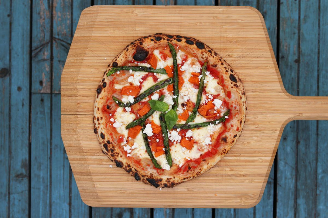 À l'aide d'une petite quantité de farine, saupoudrez votre pelle à pizza Ooni. Étirez la boule de pâte à pizza et posez-la sur votre pelle à pizza. Avec une grande cuillère ou louche, étalez une couche uniforme de sauce à pizza sur la base. Garnissez de mozzarella, d'asperges et de patate douce.