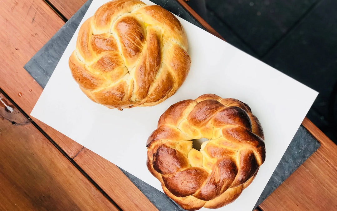 Prenez chaque extrémité de la tresse et faites-en une couronne, en pinçant les extrémités ensemble pour les sceller. Traditionnellement, le zopf est cuit comme un long pain, mais lorsque vous le cuisez dans votre Ooni, la forme circulaire permet une cuisson plus uniforme.