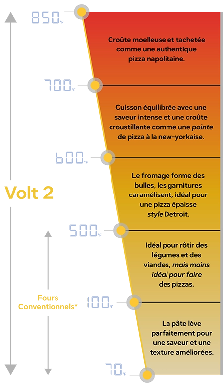 Volt 2 atteint des températures que votre four conventionnel ne pourrait qu’envier, montant rapidement et en toute sécurité jusqu’à 850 °F, soit les mêmes températures extrêmes utilisées par les chefs professionnels, vous permettant de préparer chez vous une pizza napolitaine à la croûte parfaitement tachetée.
